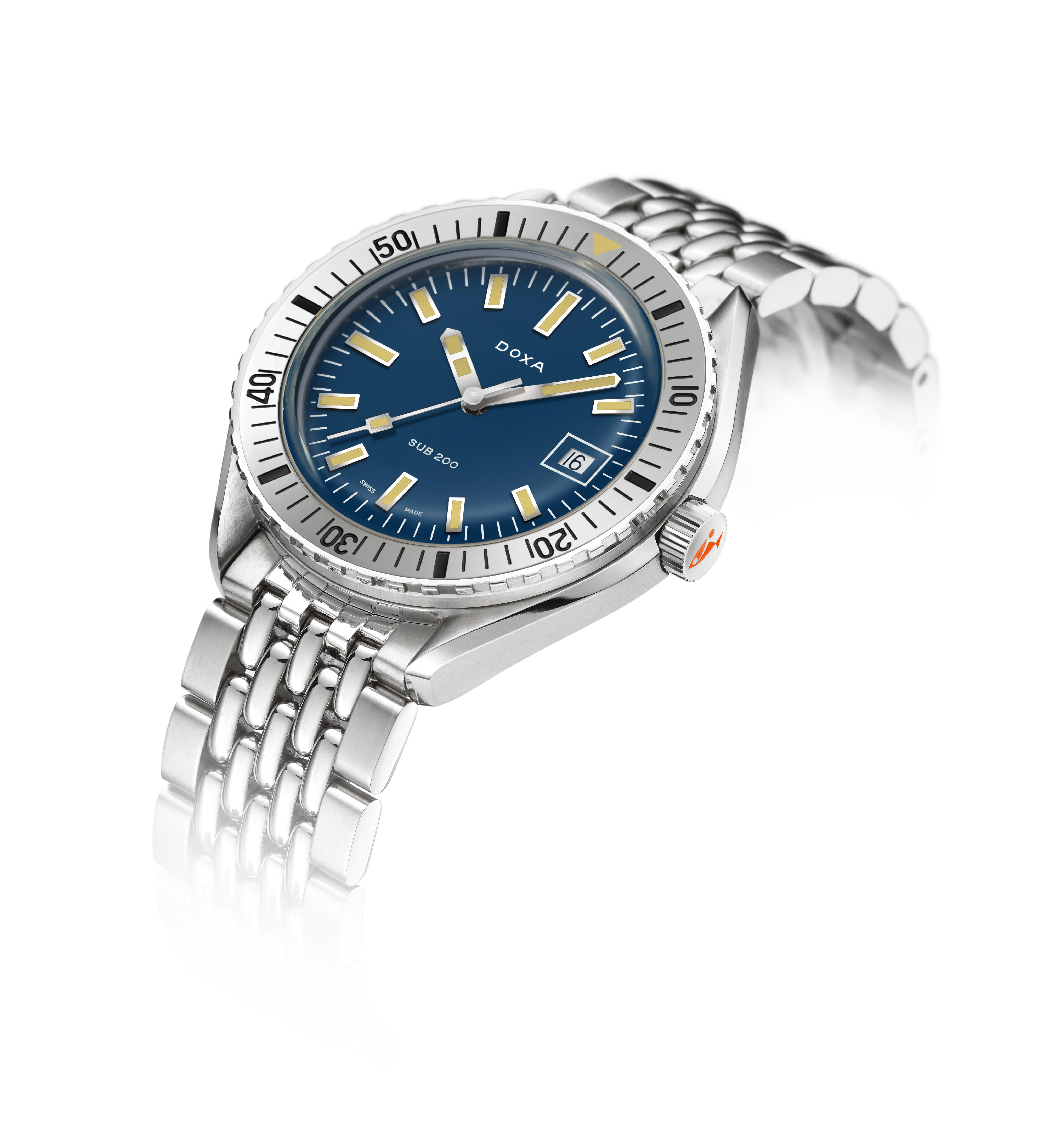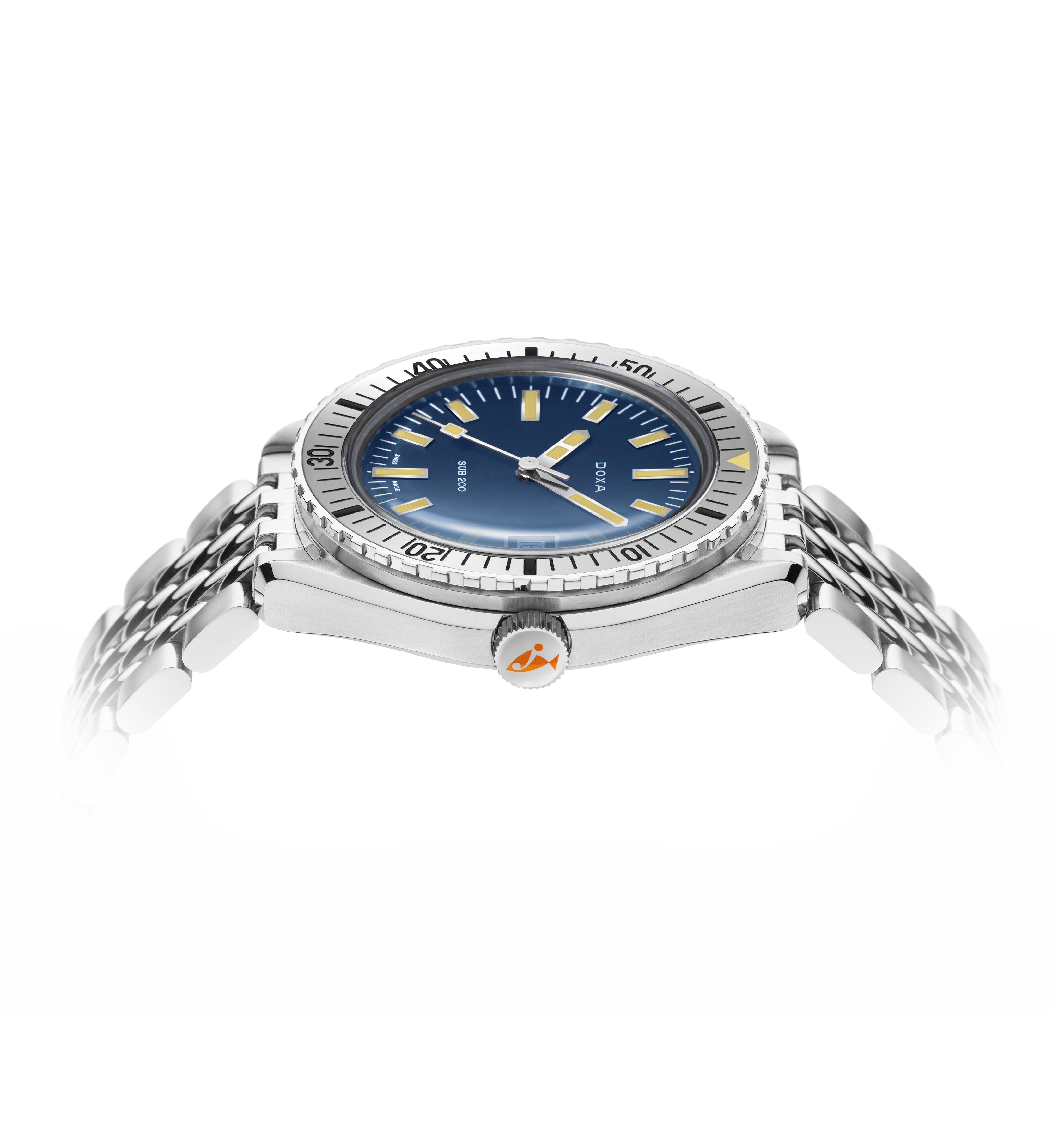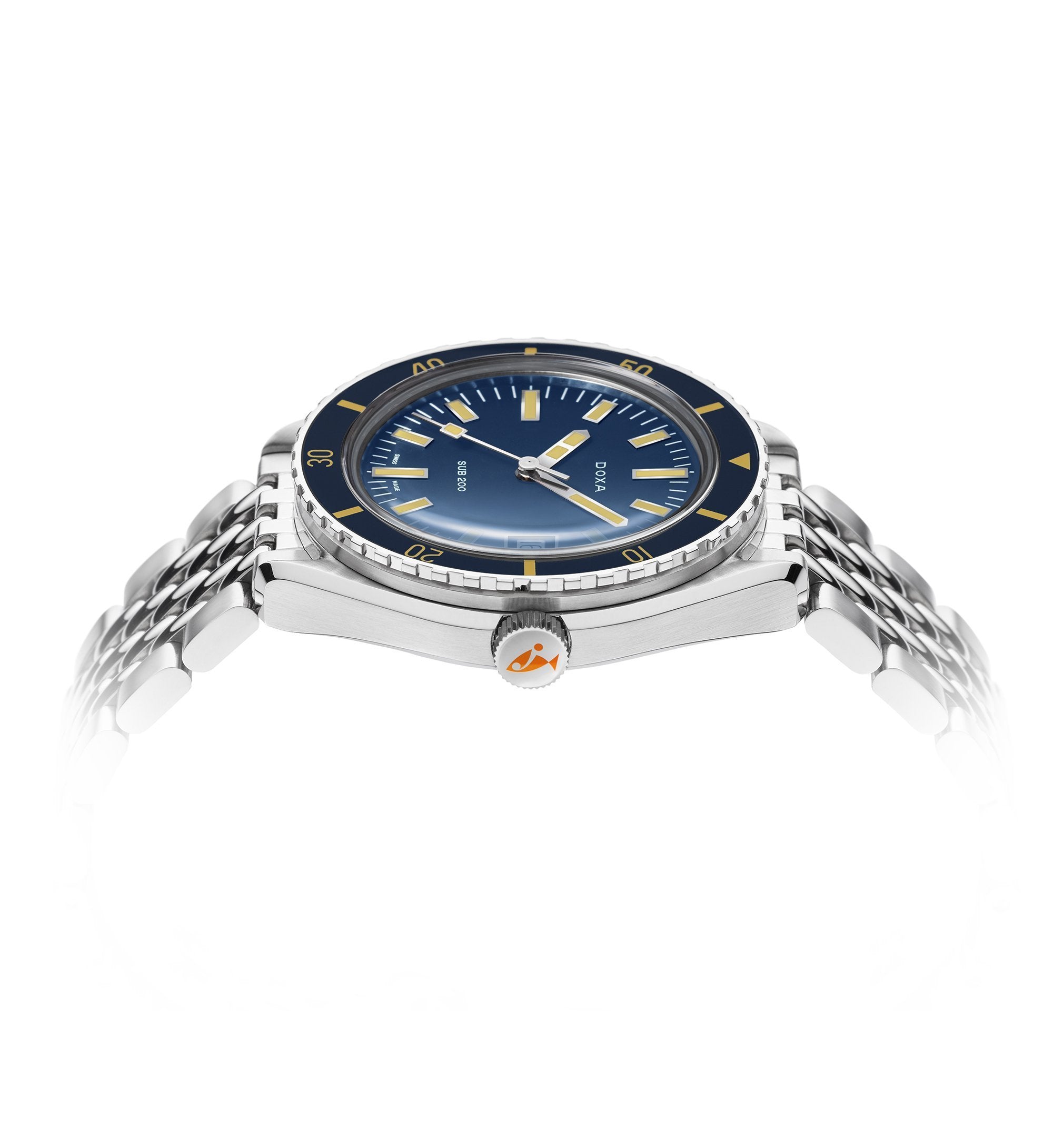Unveiled at Baselworld 2019, this 3-hand diver's watch has a case made of highest-quality 316L stainless steel. At a diameter of 42 mm, the SUB 200 is topped by a scratch-resistant sapphire crystal with an anti-reflective coating and the distinctive curvature of the domed plexiglass used back in the day. Waterproof to a depth of 200 meters (20 ATM), the model features a unidirectional rotating bezel. All the elements providing dive-relevant information, including the bezel, have a Super-LumiNova luminescent coating. The bracelet is 316L stainless steel and features a folding clasp with the DOXA fish symbol.