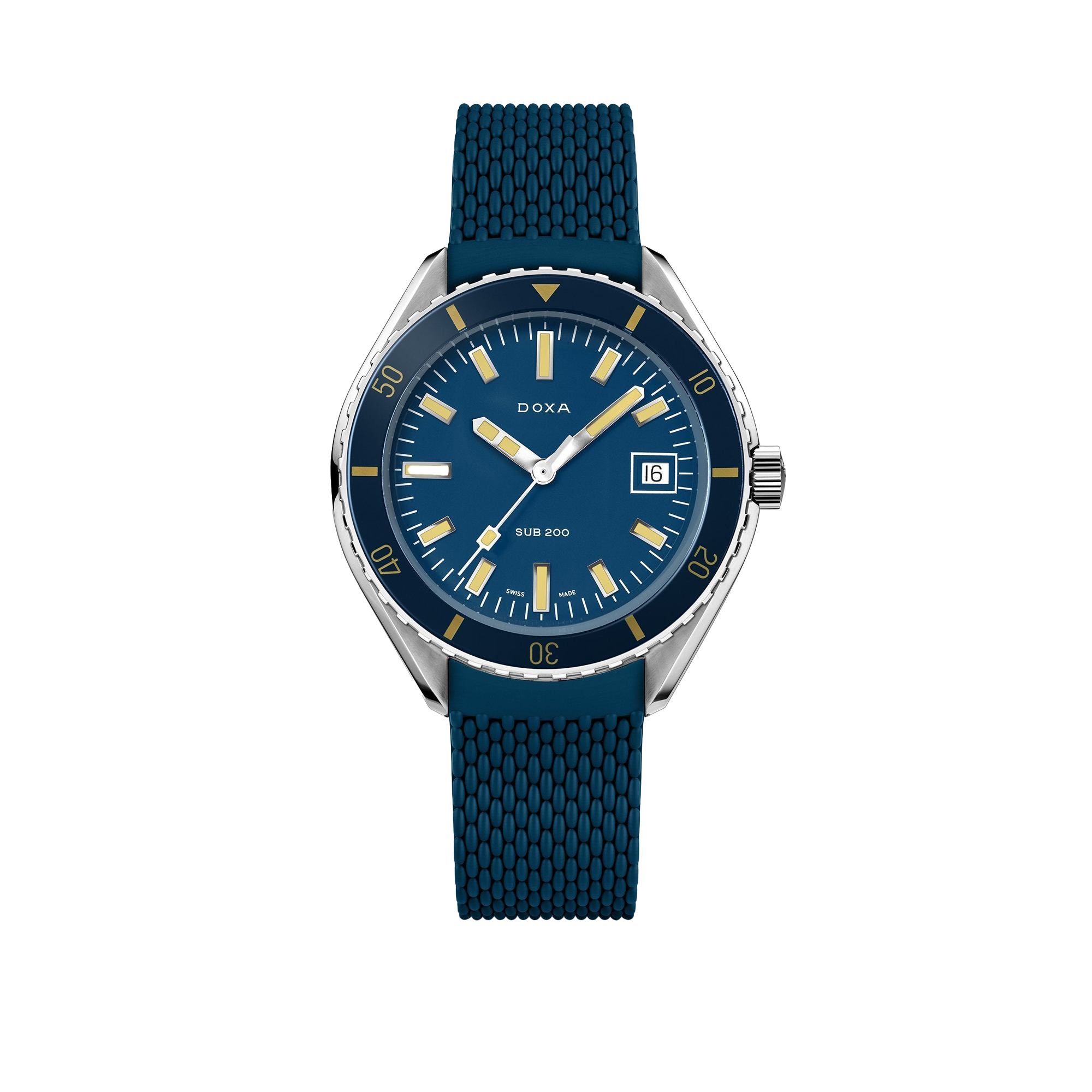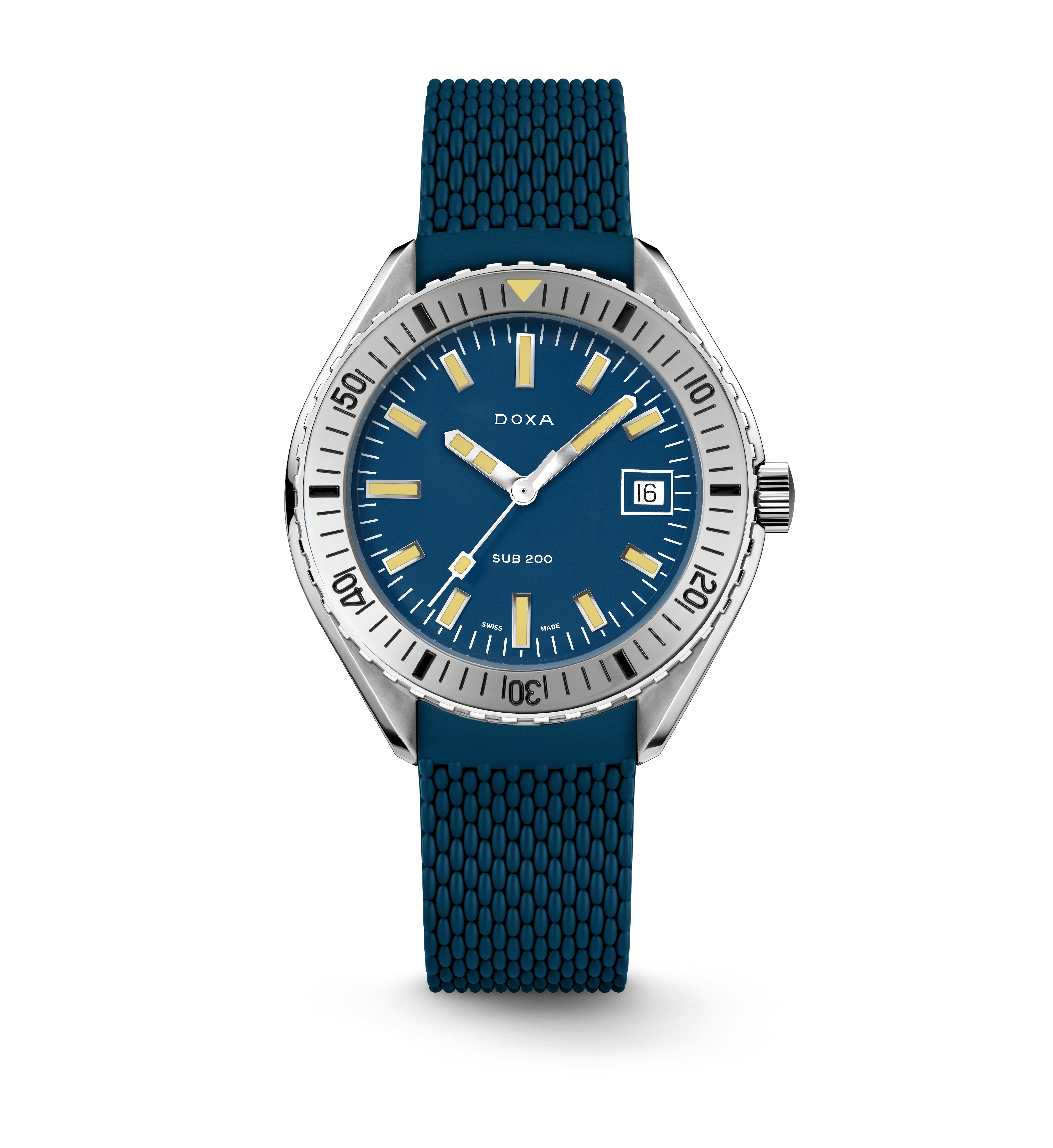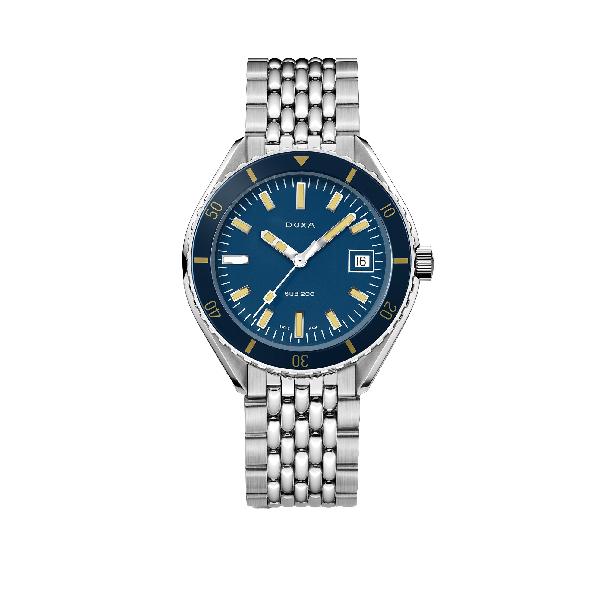 Unveiled at Baselworld 2019, this 3-hand diver's watch has a case made of highest-quality 316L stainless steel. At a diameter of 42 mm, the SUB 200 is topped by a scratch-resistant sapphire crystal with an anti-reflective coating and the distinctive curvature of the domed plexiglass used back in the day. Waterproof to a depth of 200 meters (20 ATM), the model features a unidirectional rotating bezel. All the elements providing dive-relevant information, including the bezel, have a Super-LumiNova luminescent coating. The bracelet is 316L stainless steel and features a folding clasp with the DOXA fish symbol.