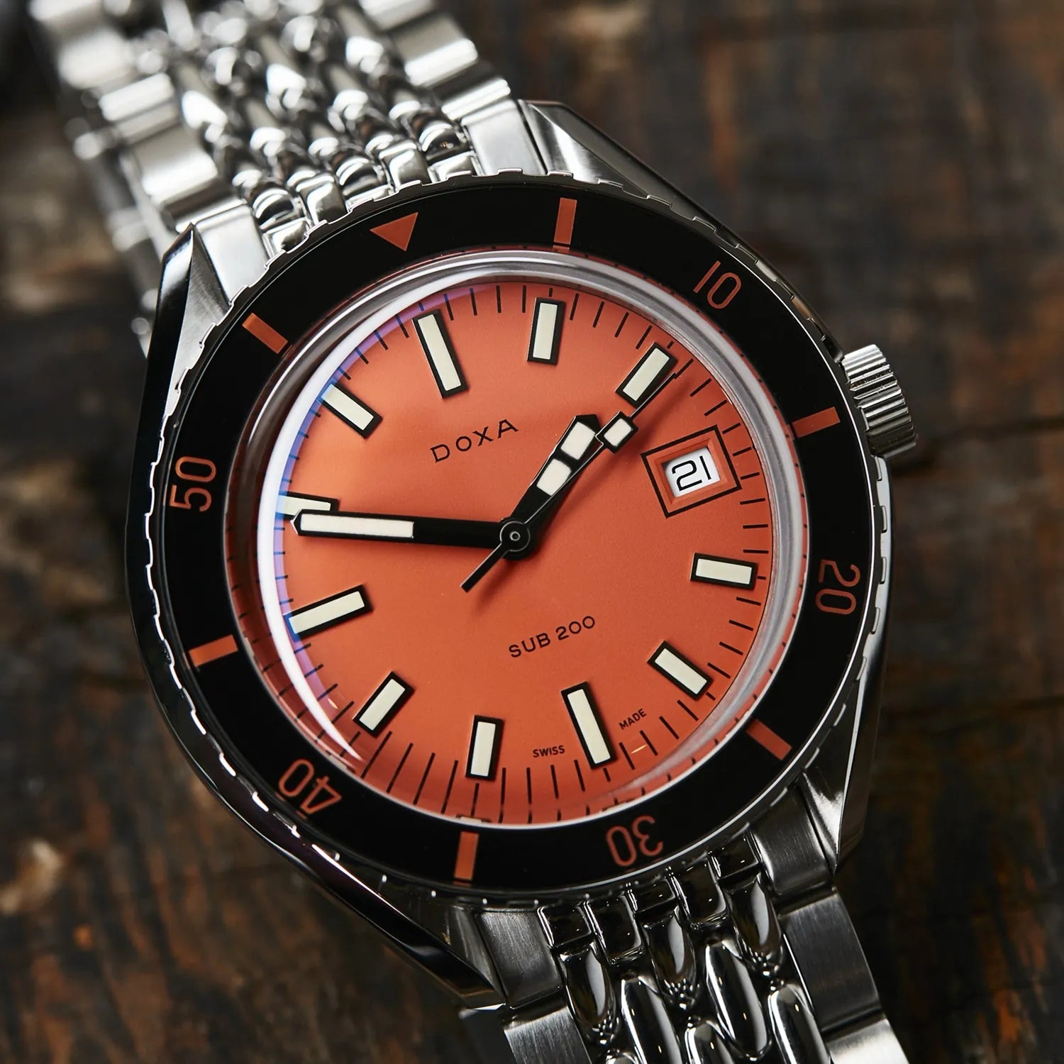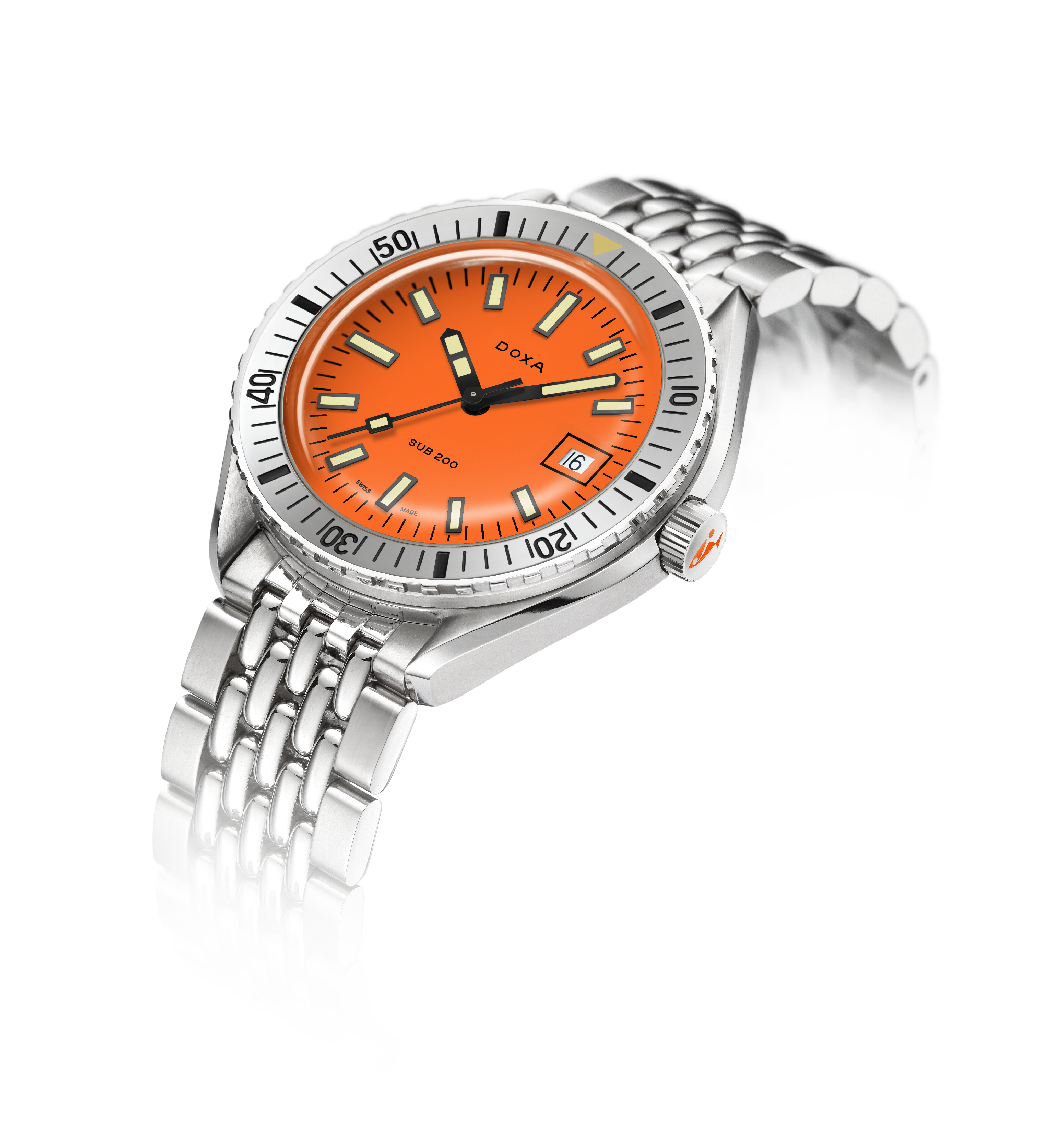 At a diameter of 42 mm, the SUB 200 is topped by a scratch-resistant sapphire crystal with an anti-reflective coating and the distinctive curvature of the domed plexiglass used back in the day.