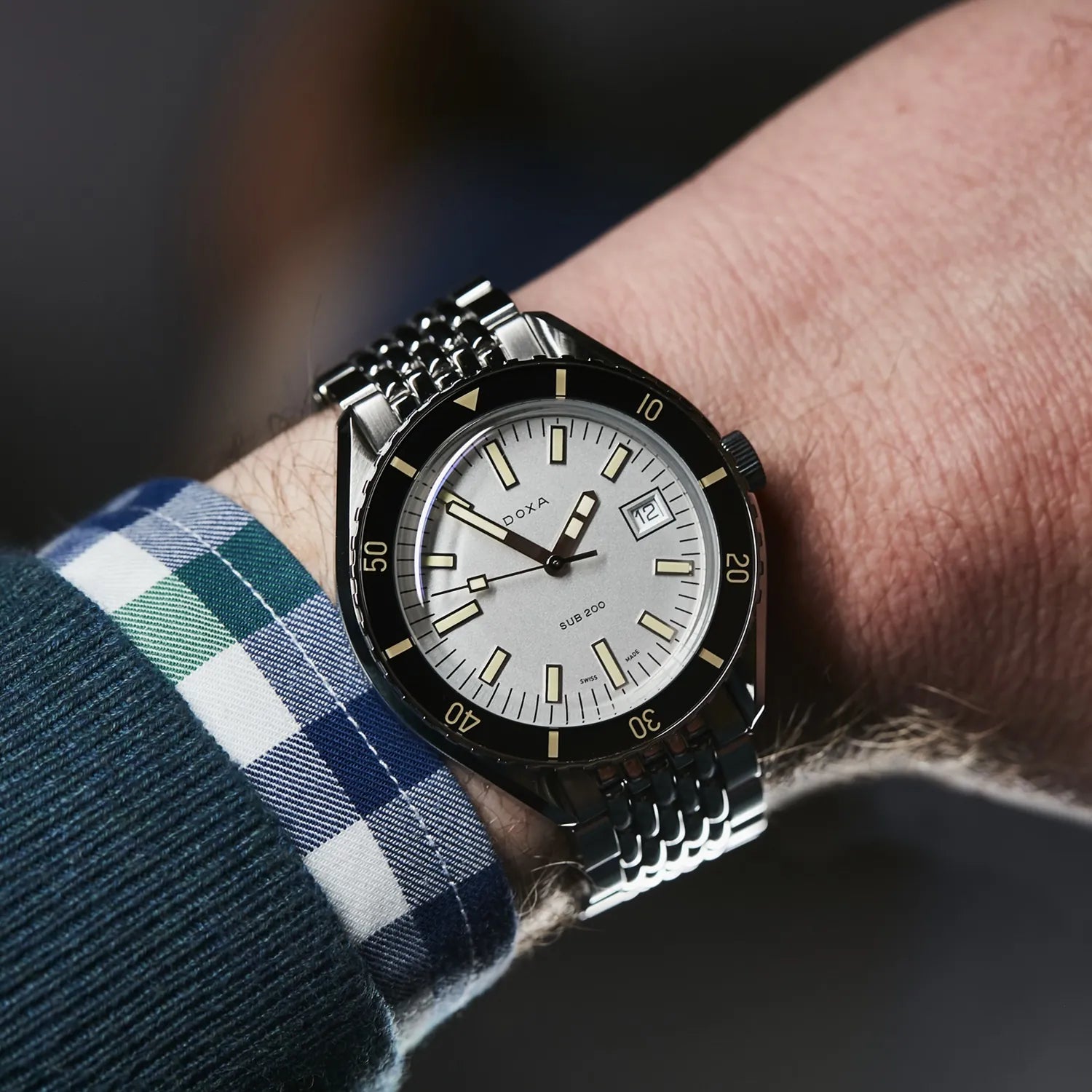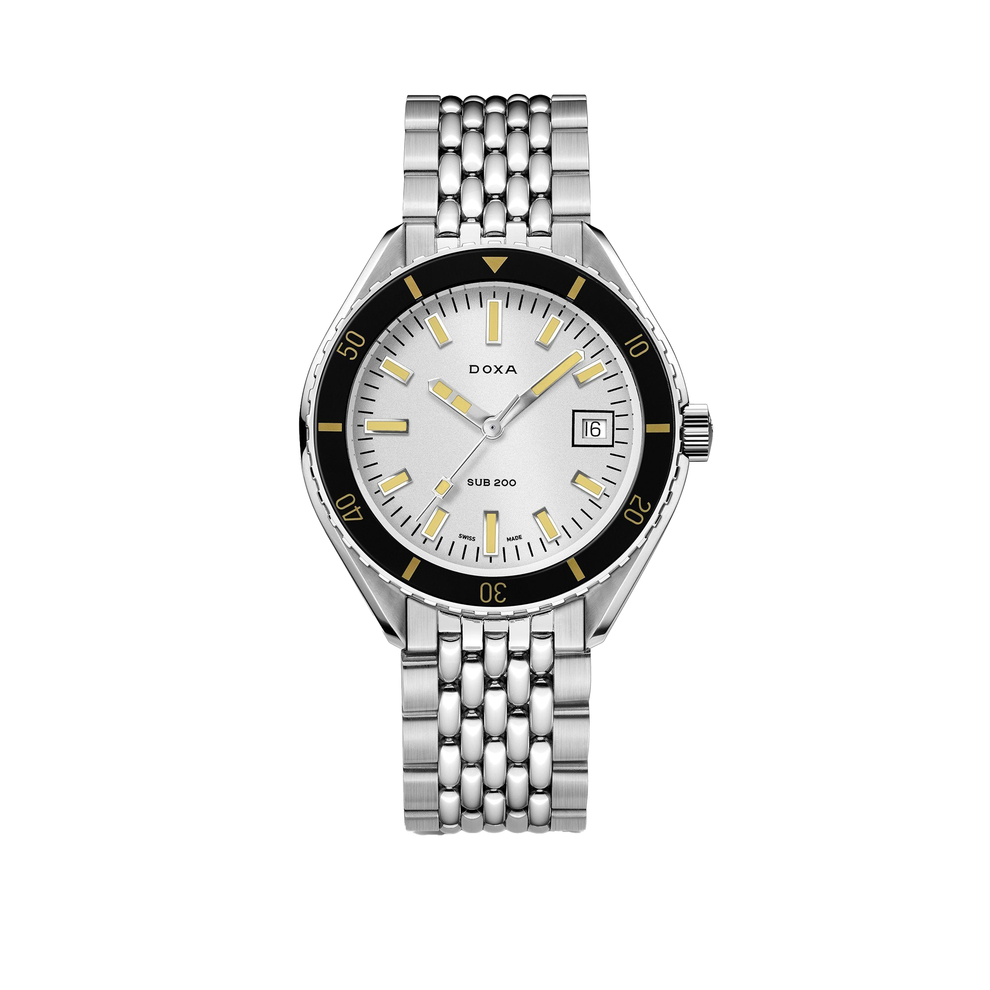 Unveiled at Baselworld 2019, this 3-hand diver's watch has a case made of highest-quality 316L stainless steel. At a diameter of 42 mm, the SUB 200 is topped by a scratch-resistant sapphire crystal with an anti-reflective coating and the distinctive curvature of the domed plexiglass used back in the day. Waterproof to a depth of 200 meters (20 ATM), the model features a unidirectional rotating bezel. All the elements providing dive-relevant information, including the bezel, have a Super-LumiNova luminescent coating. The bracelet is 316L stainless steel and features a folding clasp with the DOXA fish symbol.
