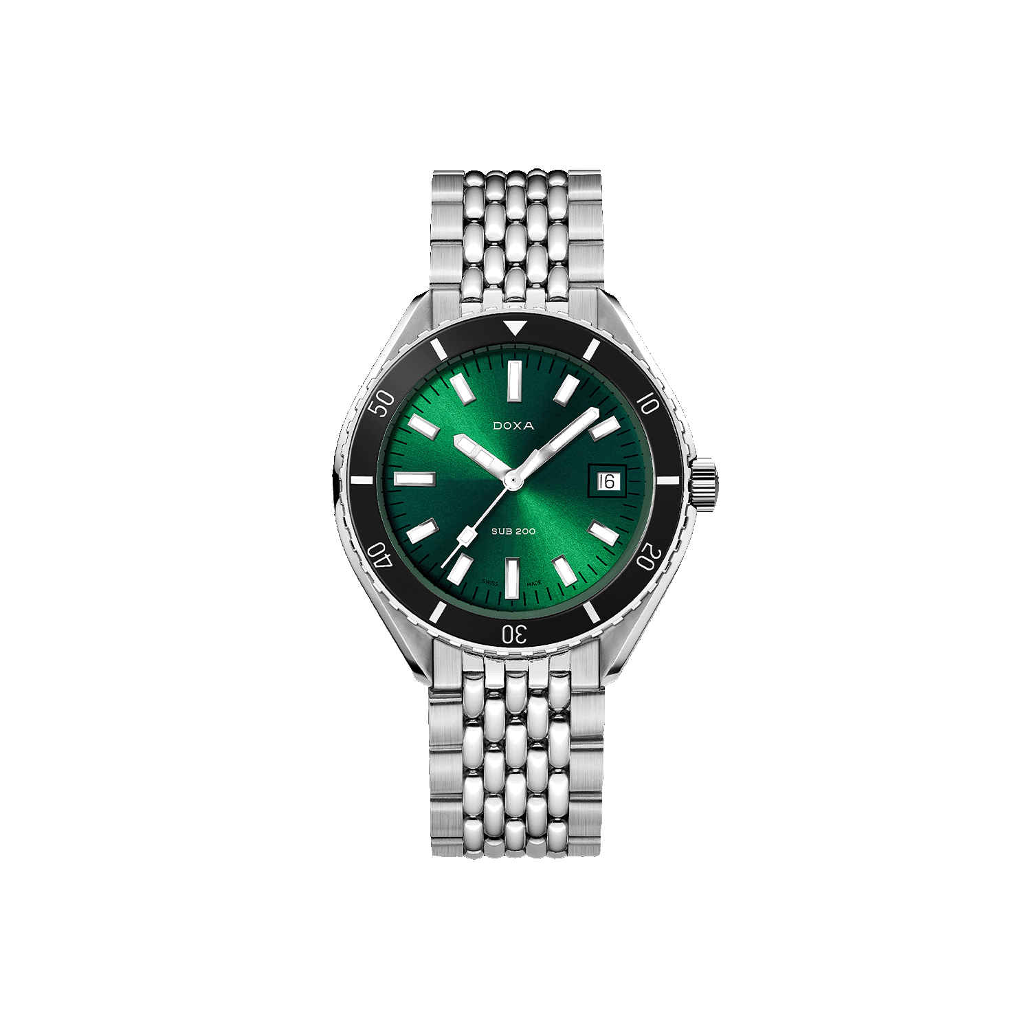 Unveiled at Baselworld 2019, this 3-hand diver's watch has a case made of highest-quality 316L stainless steel. At a diameter of 42 mm, the SUB 200 is topped by a scratch-resistant sapphire crystal with an anti-reflective coating and the distinctive curvature of the domed plexiglass used back in the day. Waterproof to a depth of 200 meters (20 ATM), the model features a unidirectional rotating bezel. All the elements providing dive-relevant information, including the bezel, have a Super‑LumiNova® luminescent coating. The bracelet is 316L stainless steel and features a folding clasp with the DOXA fish symbol.