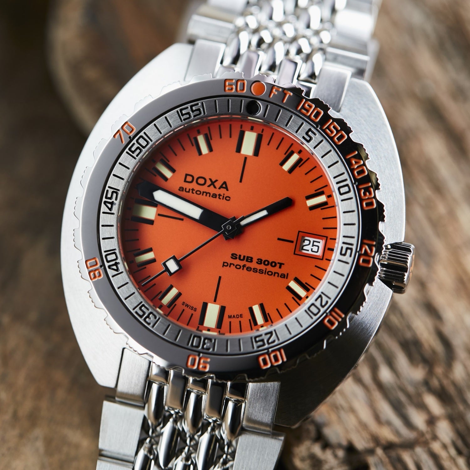 This 3-hand diver's watch, available in 6 dial colors, combines the aesthetic genes of the SUB 300T Conquistador with the technical refinements that define the high-performance diver's watch of today. Constructed from 316L stainless steel of the highest quality, the SUB 300T has a diameter of 42.5mm and a scratch-resistant sapphire crystal with an anti-reflective coating. Rated to withstand pressures up to 120 bar, this diver is effectively waterproof to a depth of 1,200 meters and features the patented unidirectional rotating bezel with an integrated no-decompression dive time calculator. All elements providing dive-relevant information are highlighted with a Super-LumiNova luminescent insert to ensure optimal legibility underwater. The bracelet is 316L stainless steel and features a folding clasp with the DOXA fish symbol.