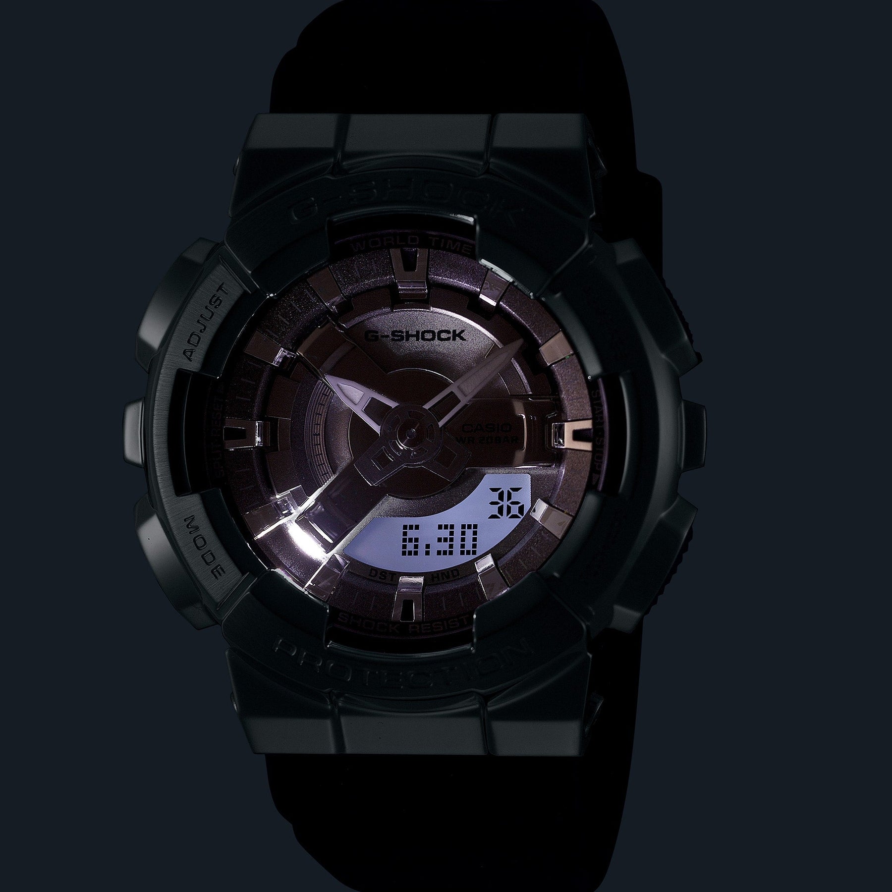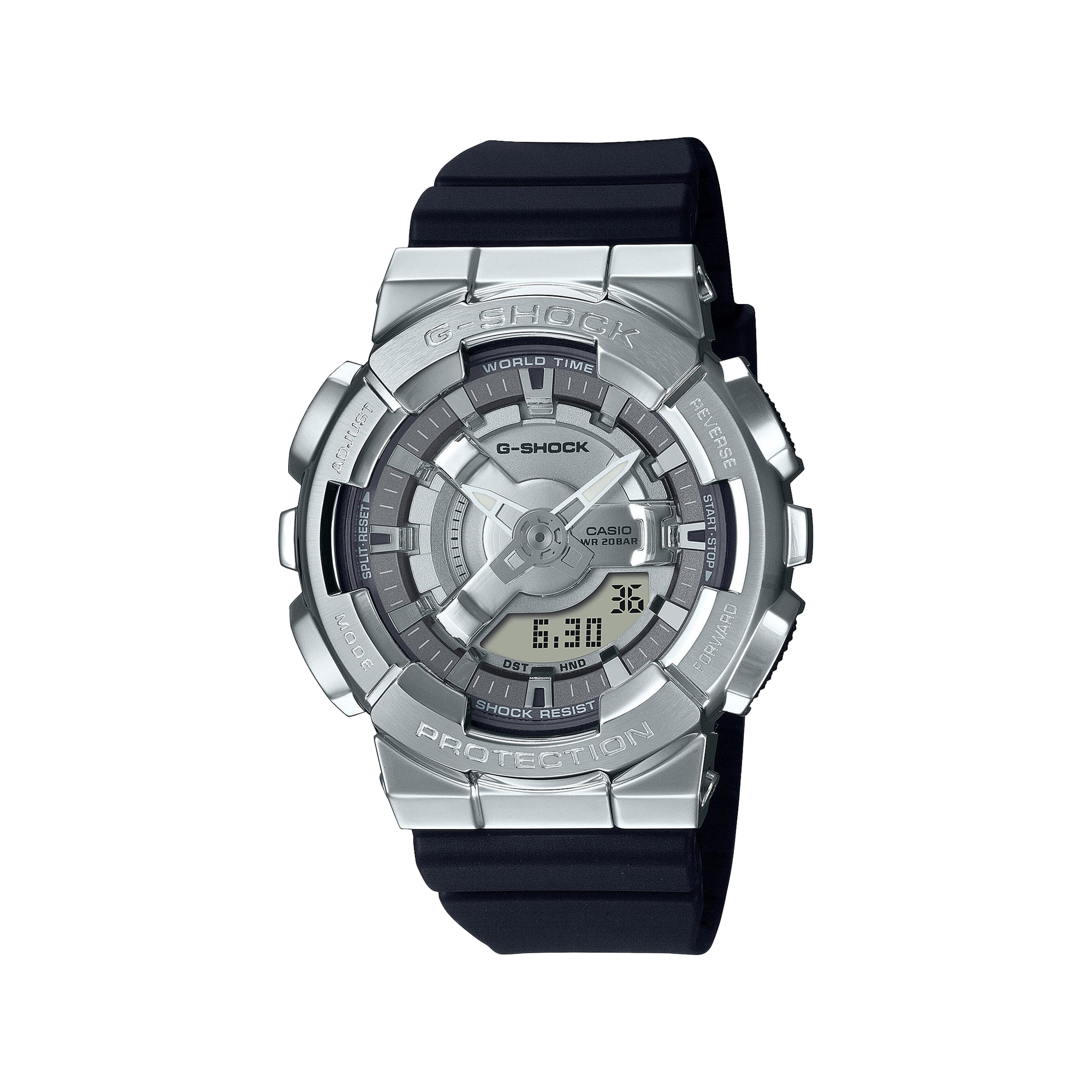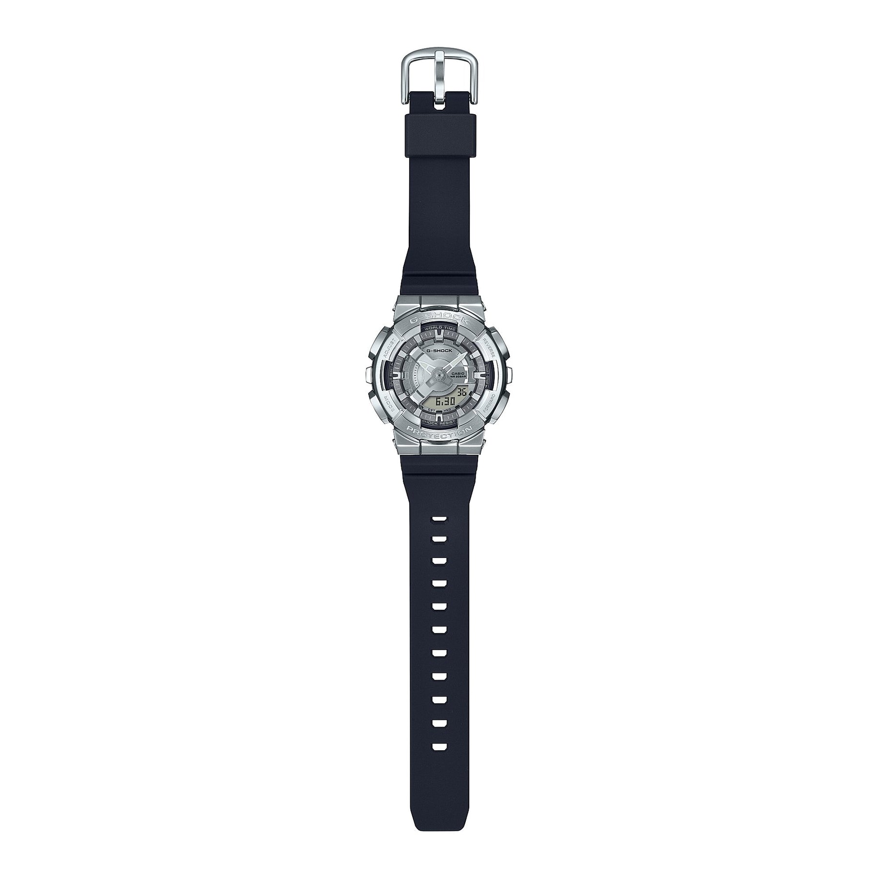 Go metal-clad in total comfort - with the popular GM-110 analogue-digital combination G-SHOCK, now in an even slimmer, more compact construction. The striking depth and dimension of the dial is crafted with a multi-layered arrangement of finely detailed 3D components.